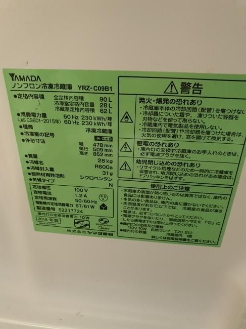 YAMADA YRZ-C09B1 90L 2ドア冷凍冷蔵庫